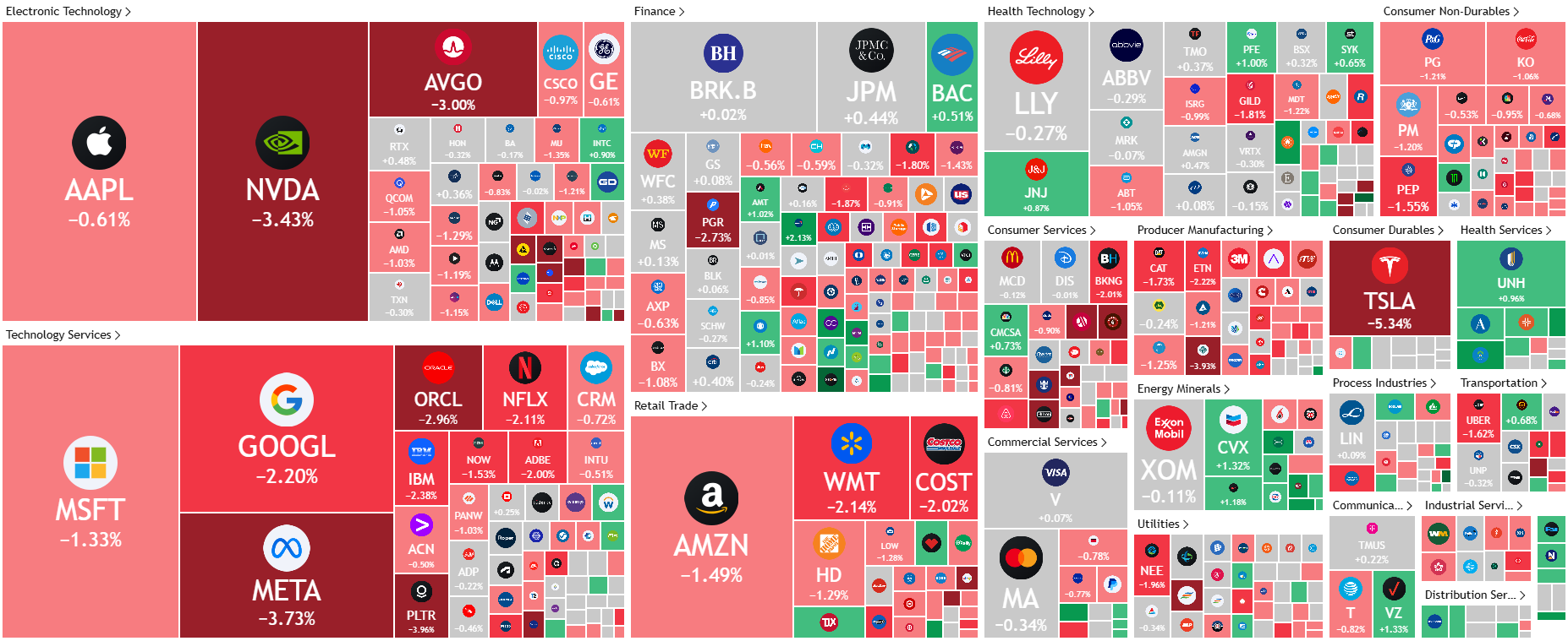 美国股市:受到消息面影响较小,主要下跌的时间点都是开盘时段,受到投资情绪影响较大。市场对美国衰退的恐惧依旧没有解除。因此美股大盘在盘前市场便开始下跌,而在美市开盘时暴跌,其中英伟达、特斯拉、Meta与博通等高估值科技巨头跌幅最重。其他板块表现各异,普遍受到科技拖累。纳指表现最差,道指相对抗压。