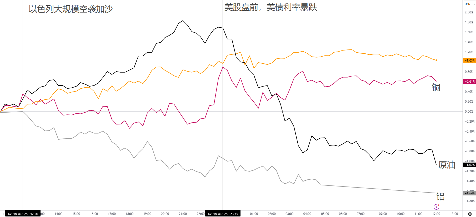 大宗商品是少数受到战争影响的市场。就在特朗普宣布胡塞武装的所有袭击都将归咎于伊朗之后,有了美国的支持,以色列信心大增。昨日早盘,以色列推翻停火协议,对加沙地区实施大规模空袭。理由是为了实现战争目标,并迫使哈马斯释放所有人质。胡塞武装也宣布,将采取最高级别的行动打击以色列。受此影响,战争风险升温,美伊关系紧张担忧令黄金与原油价格早盘持续上涨。
