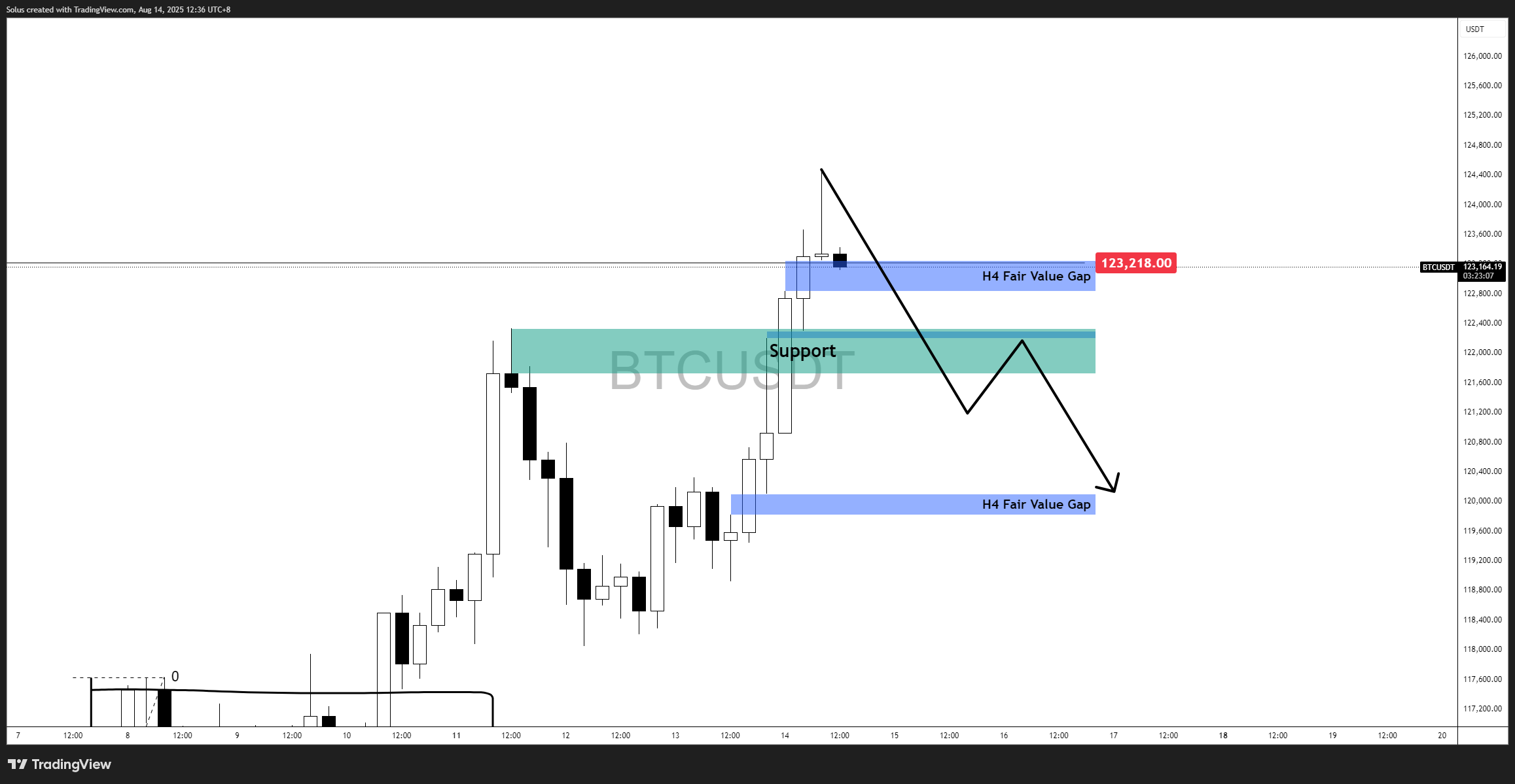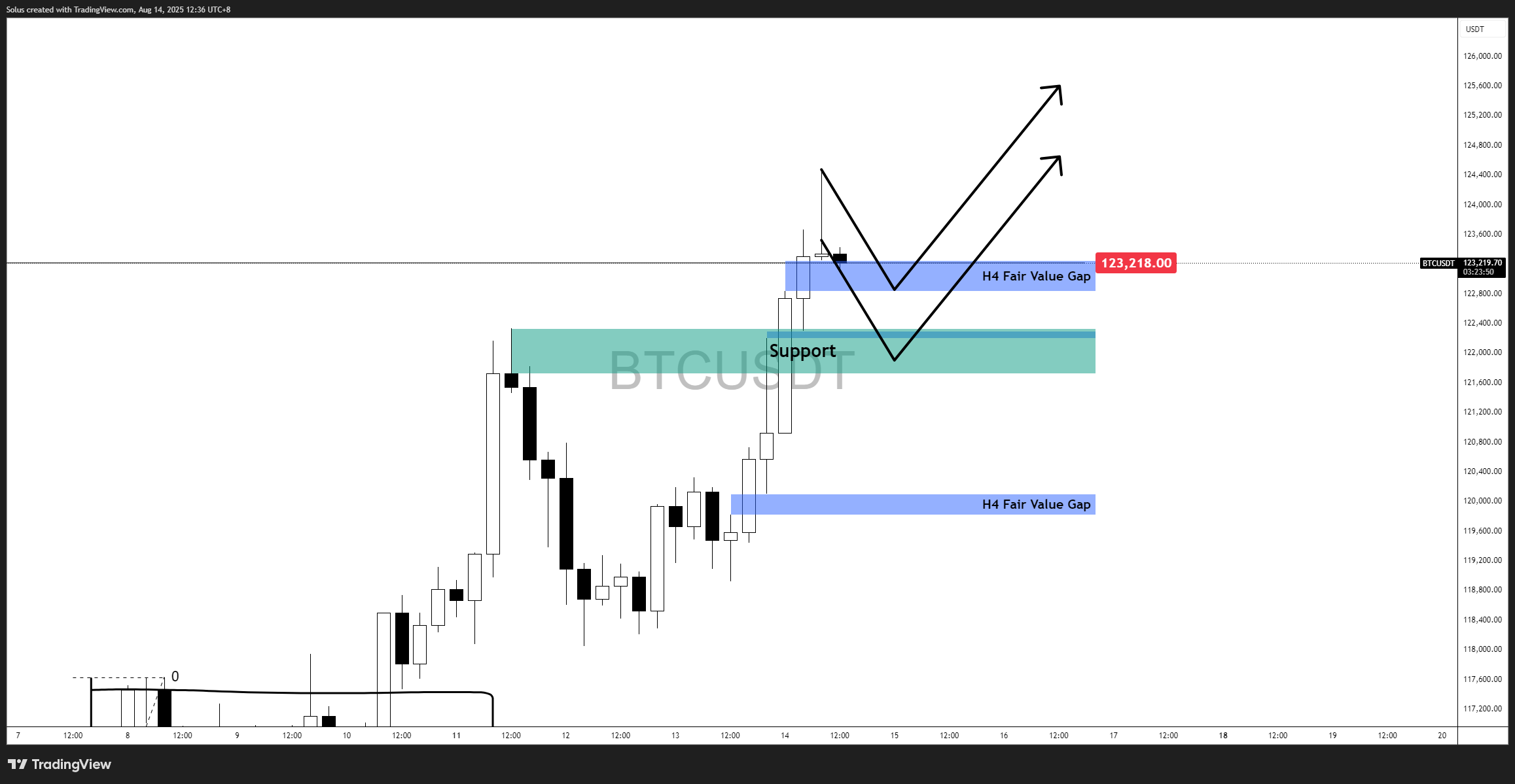 Bitcoin has extended its breakout beyond the $120k previous resistance turned-support and is now testing the H4 Fair Value Gap. The structure suggests a potential continuation toward new highs if price respects the immediate support zones.