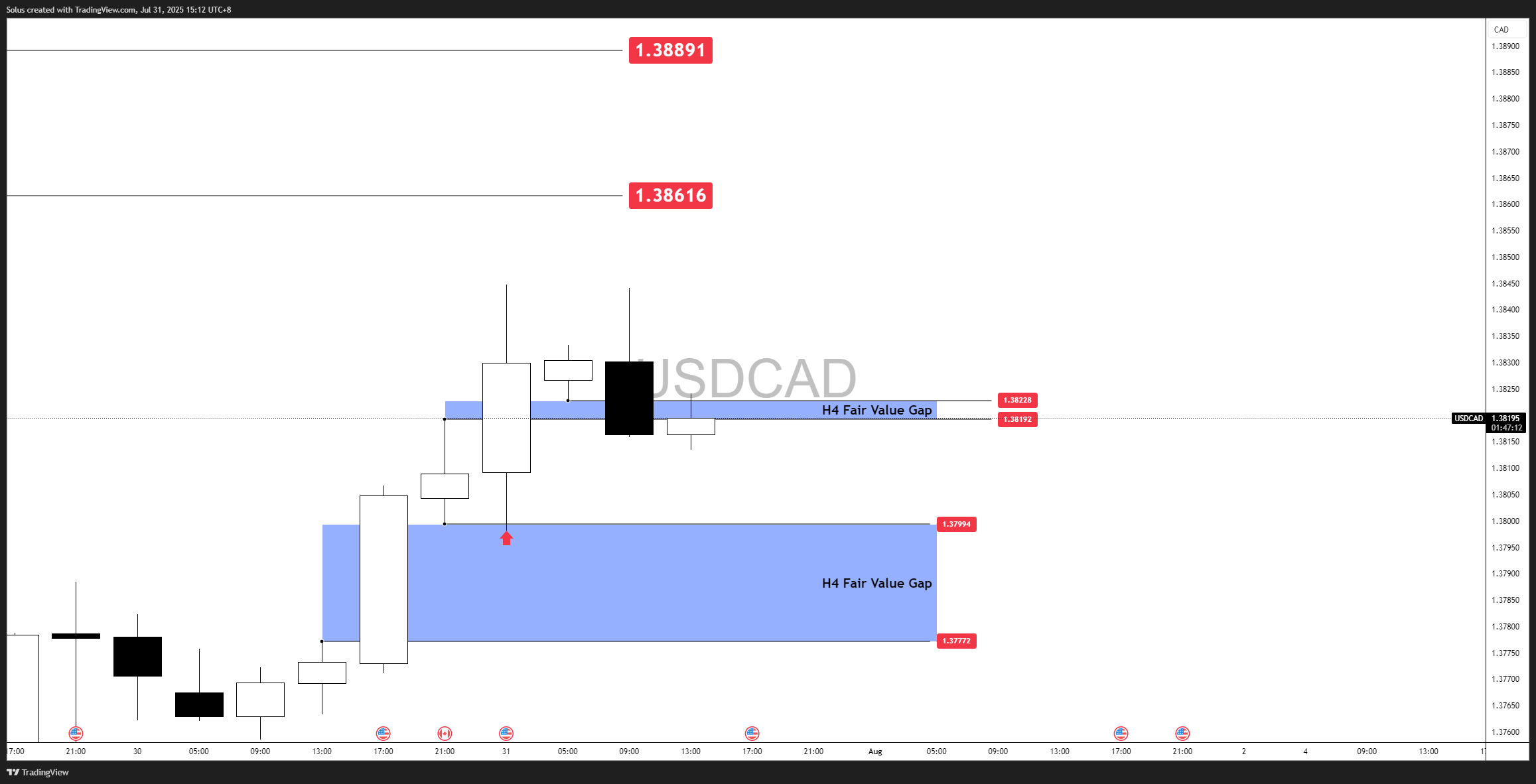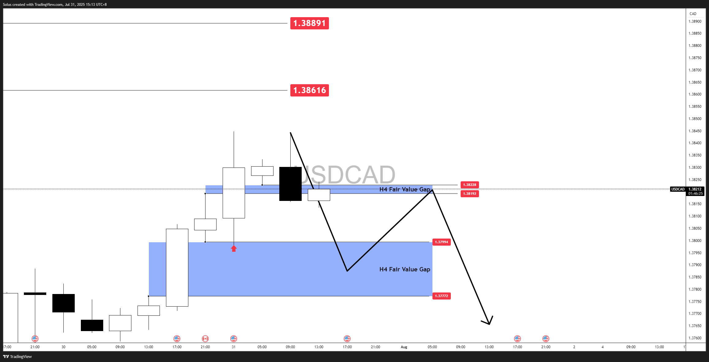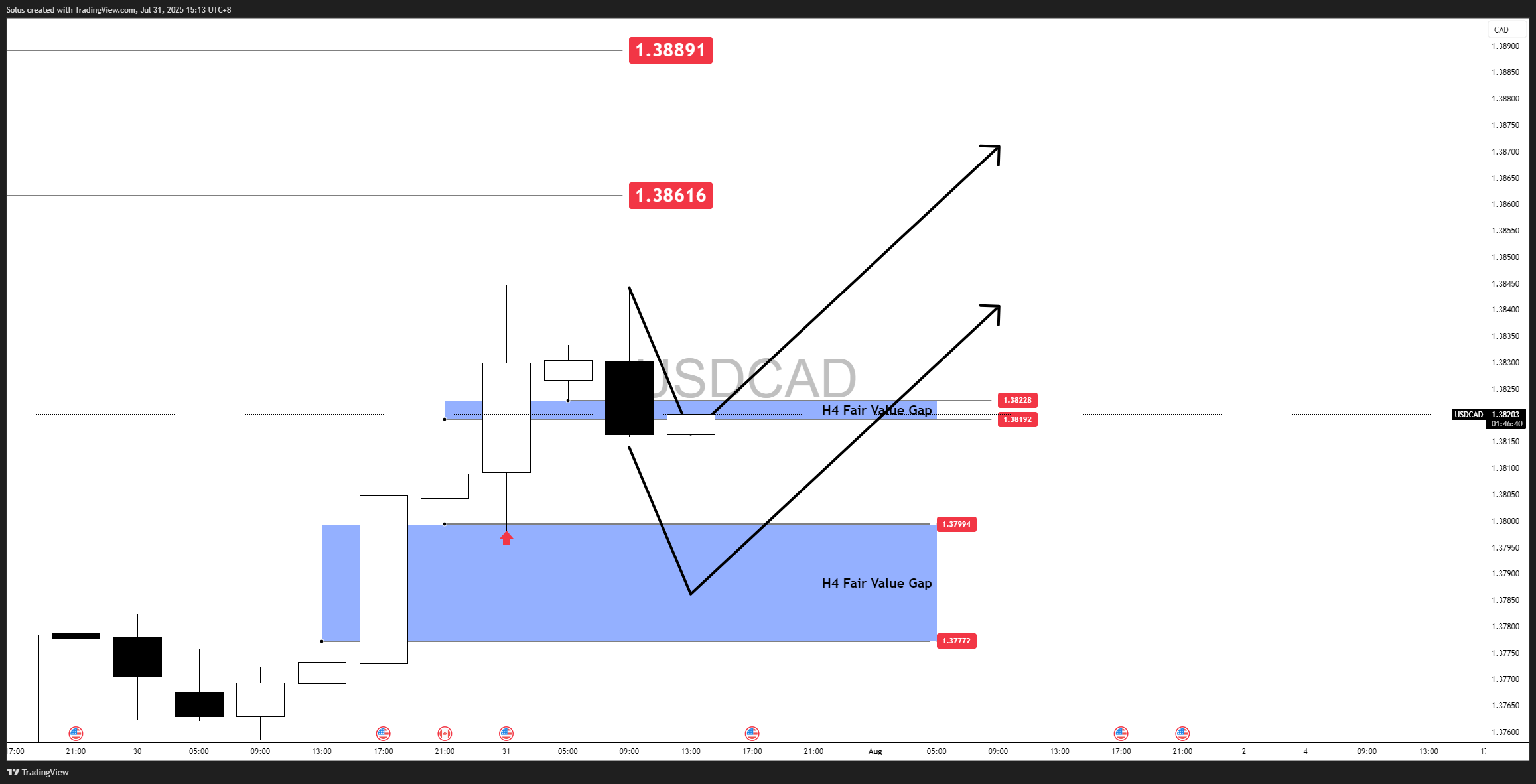 USD/CAD is currently hovering near the 1.3819–1.3822 zone, which aligns with a H4 Fair Value Gap (FVG) acting as short-term resistance. Price recently rallied into this level after confirming a bullish continuation from the previous discount zone we mapped out.
