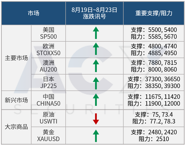 自8月5日全球股灾以来,大多股指几乎已收复跌幅,主要受上周美国公布PPI、CPI、零售销售、初领失业救济金的提振,证明美国经济虽放缓、但离衰退还有一段距离,本周鲍威尔在全球央行年会,若能透漏9月降息1码的乐观讯号,将有利股指延续强势。日本第二季GDP重回扩张,且库存呈现去化,有利下半年景气正面的支持;中国指数虽然本次跌幅较小,不过上周公布的月中经济数据终于让A50出现筑底走势,尤其一向疲弱的社零消费本次略高于预期,工业和投资虽不及预期但仍有撑,股价技术型态突破双底震荡、还站上月线。