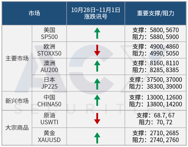 美股财报季金融股表现优异,台积电和特斯拉继续支撑AI需求,抵销掉半导体设备厂阿斯麦疲弱的订单,10年期公债收益利持续飙升,反映降息后不衰退的环境,压抑上周美股大盘表现,本周焦点在科技巨头财报、美国非农数据和大选进入最后一周,可能造成本周行情剧烈震荡,不过标普500还撑在5800点上方,维持逢低偏多。