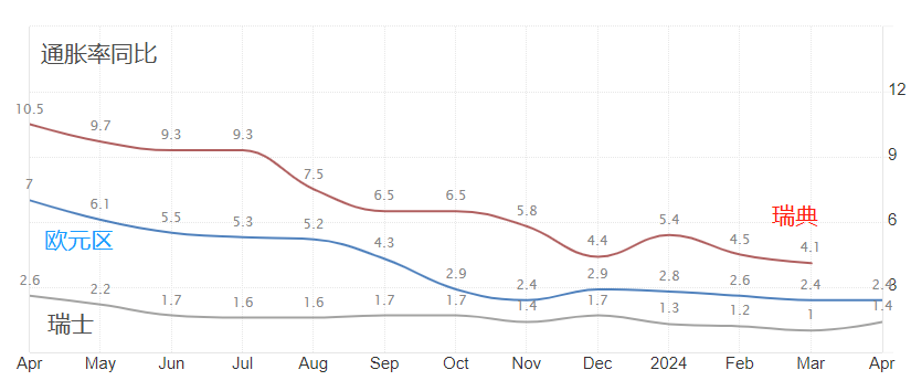 由图可见,瑞士的通胀率一年来始终保持在2%以下,选择降息是情有可原。反观瑞典,虽然4月数据还未发布(下周发布),但最新的3月通胀率却高达4.1%,过去一年的数据始终高于欧元区的平均水平。欧洲央行还没有动手,瑞典反倒先一步降息了,其中必有原由。
