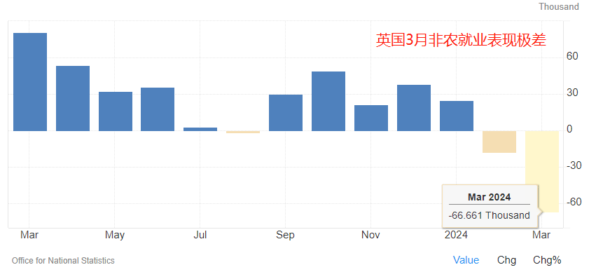 而在英吉利海峡另一边的英国,经济表现和瑞典更为相似。虽然通胀远高于2%的目标,但仍保持下滑趋势,GDP连续两个季度负增长,失业率更是连月暴增,非农就业表现极为差劲。