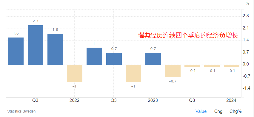 一方面,瑞典和瑞士一样在能源转型上非常成功,对化石能源的需求较低,燃煤发电的占比极小,因此其通胀受到近期国际能源价格反弹的影响不大。不过更重要的却是瑞典自身的经济表现极为糟糕,已经满足了经济衰退的定义。瑞典央行在利率声明中表示,之所以放松货币政策,是因为经济活动的疲软。那么瑞典经济到底有多差呢?