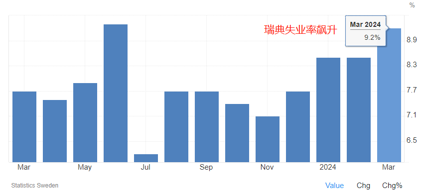 从更敏锐的失业率来看,过去一年,瑞典失业率从最低的6.2%飙升至9.2%,体现了就业市场的萎靡,同样是经济衰退的信号。