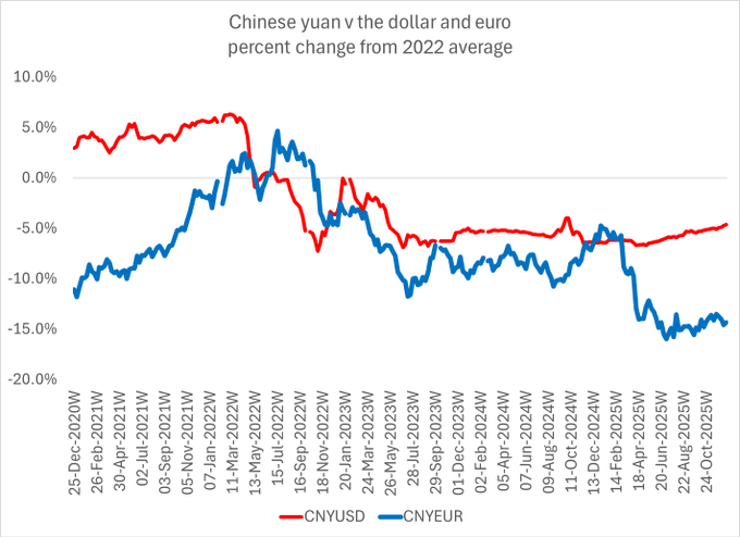 Điều này đặt Trung Quốc vào thế khó: cần điều chỉnh để CNY yếu hơn một chút so với USD nhưng đồng thời mạnh hơn so với EUR, nhằm cân bằng giữa các đối tác thương mại và duy trì ổn định vĩ mô.