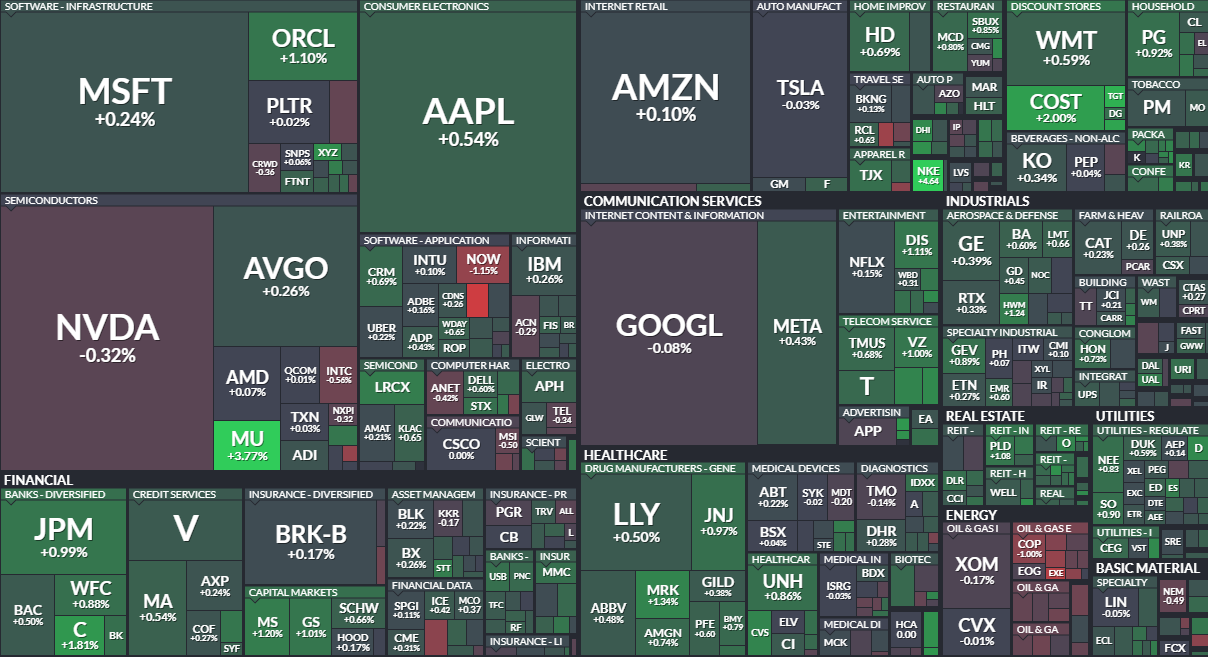 Phiên giao dịch trước Giáng Sinh mang lại không khí hứng khởi cho thị trường chứng khoán Mỹ khi S&P500 vượt đỉnh lịch sử, dòng tiền lan tỏa đều khắp các nhóm ngành.