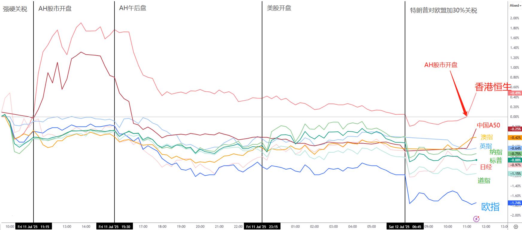 特朗普对欧盟加了30%关税,但谈判无诚意让欧盟转向与其他国家合作。两次关税消息令全球股市下跌,AH股市能够分散风险。避险需求令黄金价格保持强势上涨。