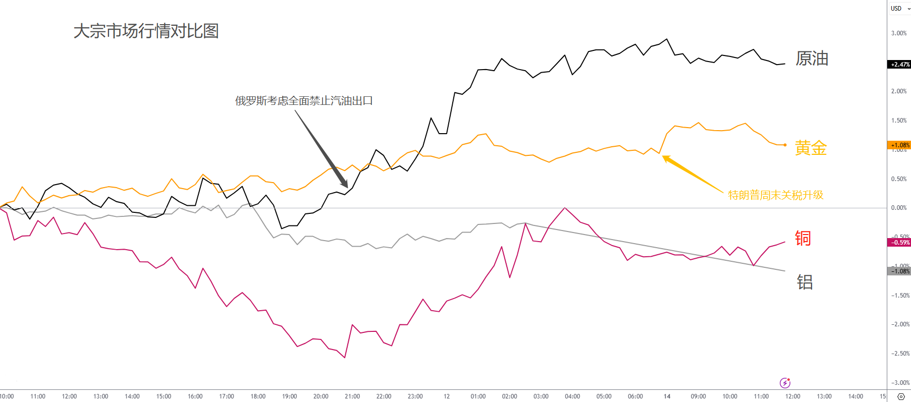 大宗市场表现出现分歧。在激进的关税态度刺激下,避险资金再度涌入黄金,令金价持续上涨。在50%关税威胁下,铜价早盘持续下跌,不过在美盘时段收回跌幅。原油价格则忽视了沙特超额生产的消息,更多受到美俄摩擦的影响,尤其在俄罗斯方面考虑全面禁止汽油出口后,油价突破并涨至当日最高。