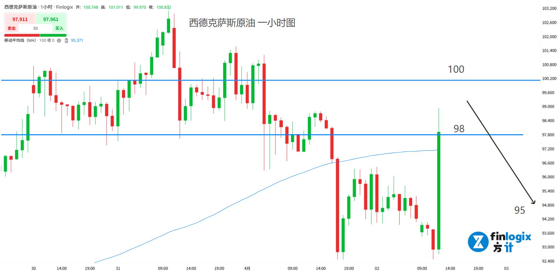 短线交易策略:(趋势跟随)98-100区间分批布局空单