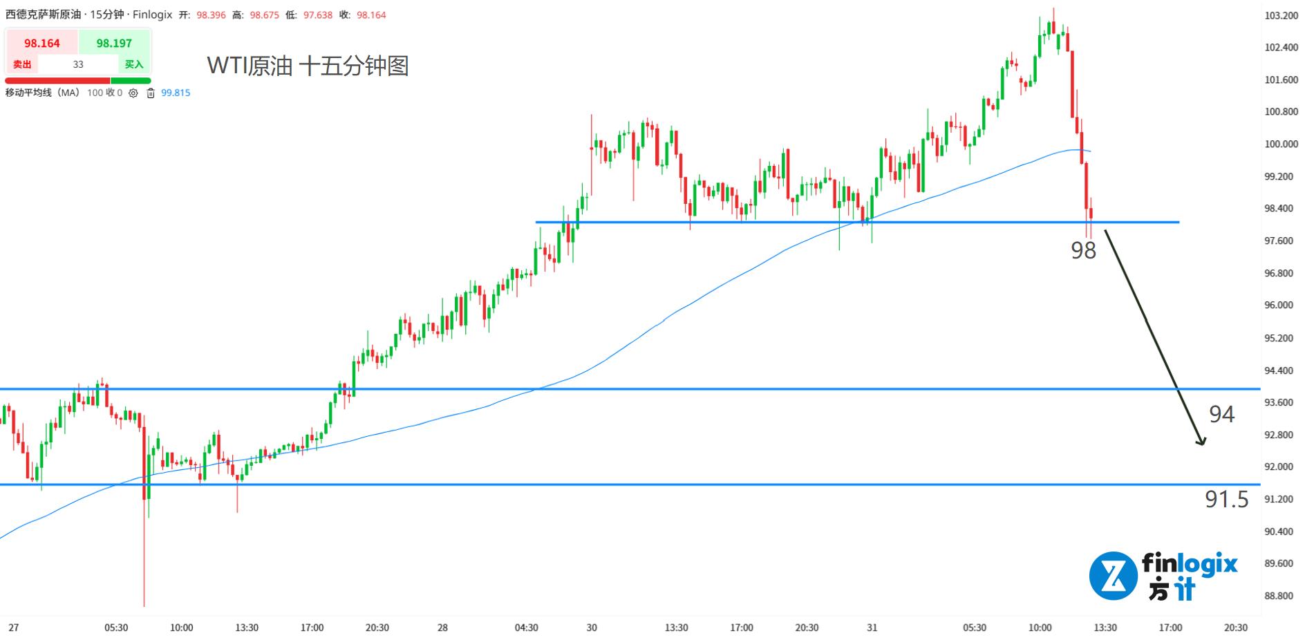 技术面:100均线出现向下拐点,油价跌势极快,暂时在98头部颈线位置站稳。但该位置很可能撑不住。一旦击穿,价格将出现新一轮暴跌,目标看93关口附近。