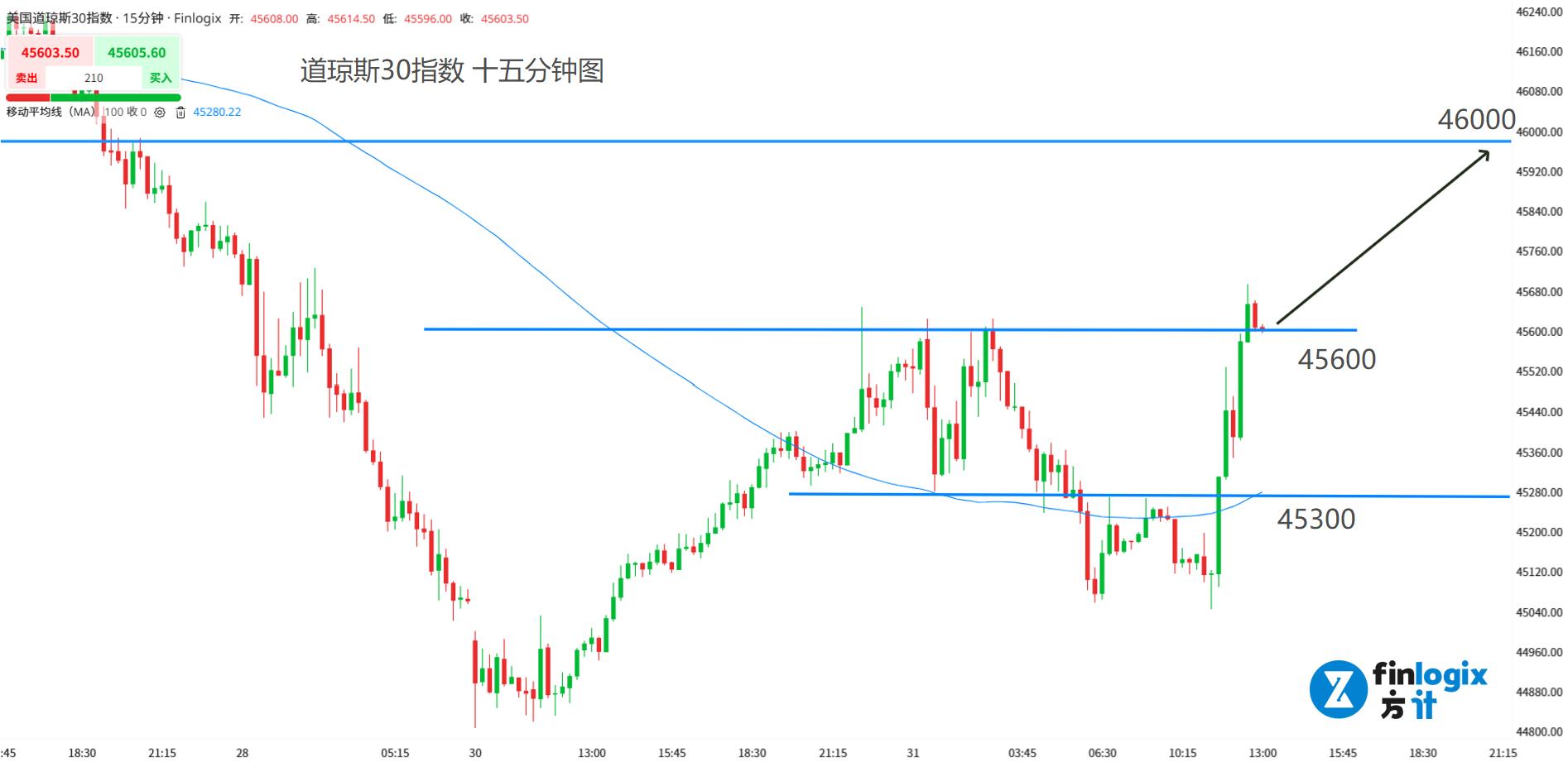 技术面:100均线转头向上,多头动能强劲。油价带利率下跌,对于金融占比较高的道指更为有利。交易策略以突破跟随为主。