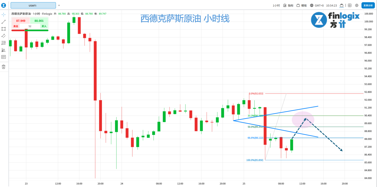 技术面:原油价格受到3月23日吞噬K线影响而受到压制,今日凌晨4点更是受到消息面影响而暴跌,若以最近的小时线波段当成参考区间,规划可能的反弹区域,因此价格若接下来反弹至89.25~91区间止涨后,有考虑做空的机会。
