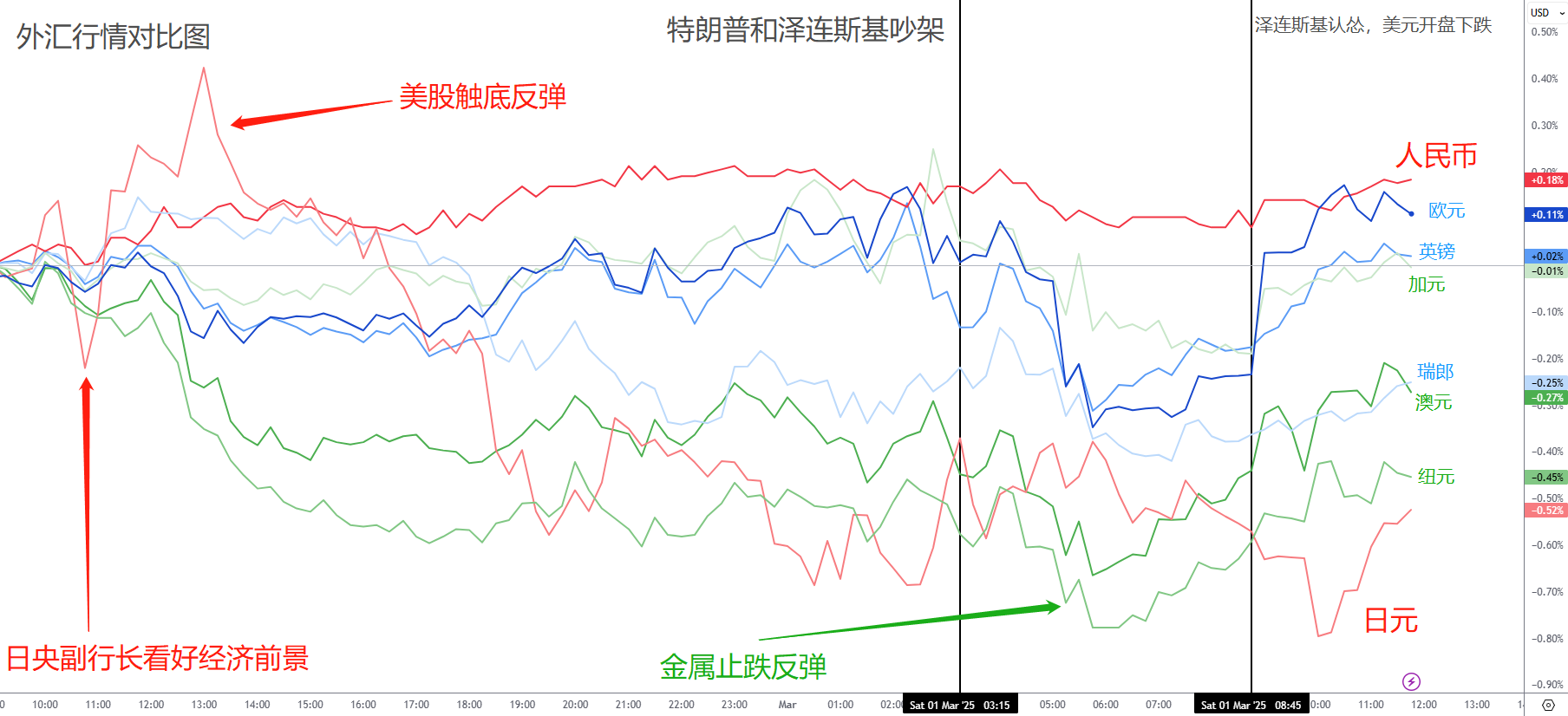 美元:亚盘与欧盘时段市场较为平静,投资者静待本周关税政策的落地。然而,美盘时段突发消息引发市场剧烈波动——乌克兰总统泽连斯基访美,原计划签署矿产协议,却因“缺乏对美国的尊重”与特朗普及万斯爆发激烈争吵。这一事件令市场瞬间躁动,因其可能意味着俄乌冲突停息无望,同时也暗示未来欧美关系或将进一步紧张。受此影响,美元走强,股市与金属承压,而原油价格逆势上扬。其中,欧元成为非美货币中跌幅最大的品种。