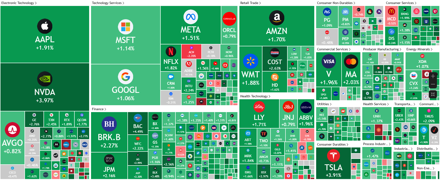 美国股市:经历多日下跌后,美股在上周五迎来强劲反弹。早盘即开始走强,尾盘阶段涨势加速,可能与美债利率持续下行有关。十一大板块全面收涨,英伟达与特斯拉领涨,反映市场风险情绪回暖。最终,美国三大股指走势趋同,均录得上涨。