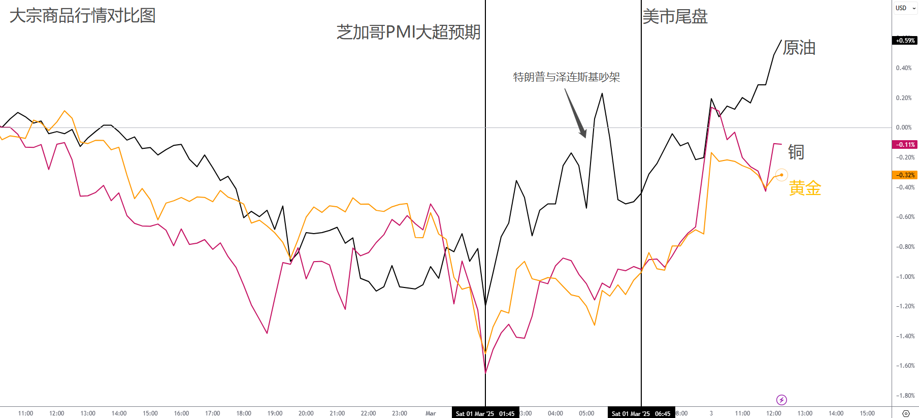 上周五美盘前,大宗商品价格持续承压,因疲软的经济数据拖累需求预期。然而,市场拐点仍由经济数据触发——美盘时段公布的芝加哥PMI数据远超预期,虽对股市提振有限,却引发大宗商品全面反弹,并在美盘尾段随美股一同加速上涨,涨势延续至今早。其中,原油受到泽连斯基“争执事件”影响,成为表现最强的品种。