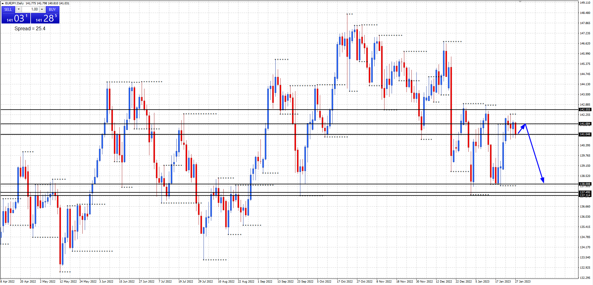 Price remained in consolidation holding below the 142.55 weekly resistance level last week. Will price move back down the range to retest the 138.00 daily support level this week?