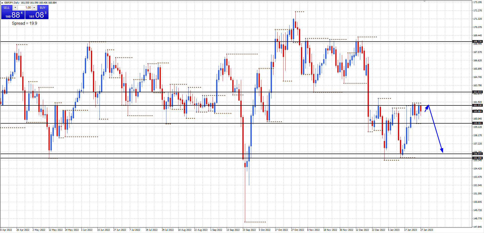 Daily support at 159.50, resistance at 161.53.