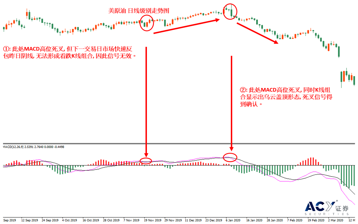 其实,这里我们只要去寻找更多走势信号来配合MACD指标运用,就能顺利化解这个难题。从下图来看,①位置市场大跌,MACD指标虽然构成死叉,但下一交易日市场快速反包昨日的阴线,此时无法构成看跌K线组合,因此此处死叉信号无效。②位置市场大跌以后,整体构成了高位乌云盖顶的看跌K线组合,再结合MACD指标高位死叉,并下穿零轴,确认了死叉信号的有效性,因此投资者可在市场发生2个以上的有效技术信号之后,进行做空操作,并拥有相对较高的交易成功率。
