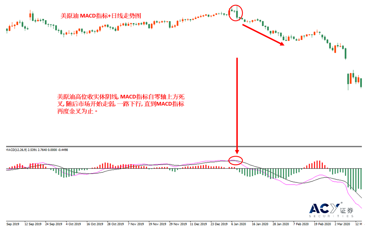 比如我们以2020年1月美原油走势图为例,1月8日美原油高位大跌,带动同处于高位的MACD指标快线慢线交叉下行,构成死叉,释放出强烈的看跌信号。随后我们可以看到,在MACD快慢线下行并击穿0轴的同时,原油价格由59美元/桶一路跌至49美元/桶,空间高达10美元,直到MACD快慢线再次金叉,市场才停住了下跌的步伐。