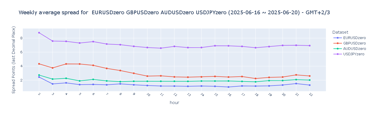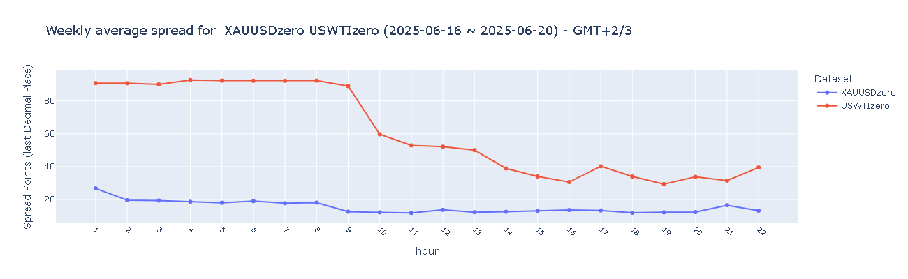 EURUSD(欧元/美元)在亚盘、欧盘和美盘时段的点差维持在良好水平(1–2点),显示整周交易稳定且具备高度流动性。