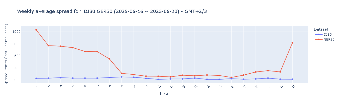 德国DAX指数(GER30)在欧盘时段表现为良好水平(200–300点),但在美盘时段点差扩大至一般水平(300–500点),亚盘时段则恶化至需改善等级(高于500点),显示欧洲以外时段的交易条件明显不利。