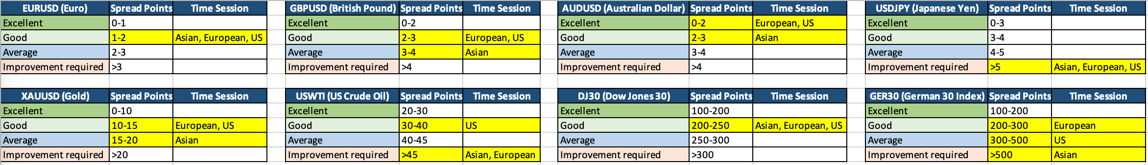USDJPY(美元/日元)在亚盘、欧盘和美盘时段的点差均降至需要改进水平(>5点),反映出点差波动性高,可能导致整体交易成本效率不佳。