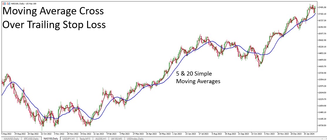You can see the example of the moving average crossover trailing stop applied to the Nasdaq100 index, which has been trending strongly since the start of January 2025.
